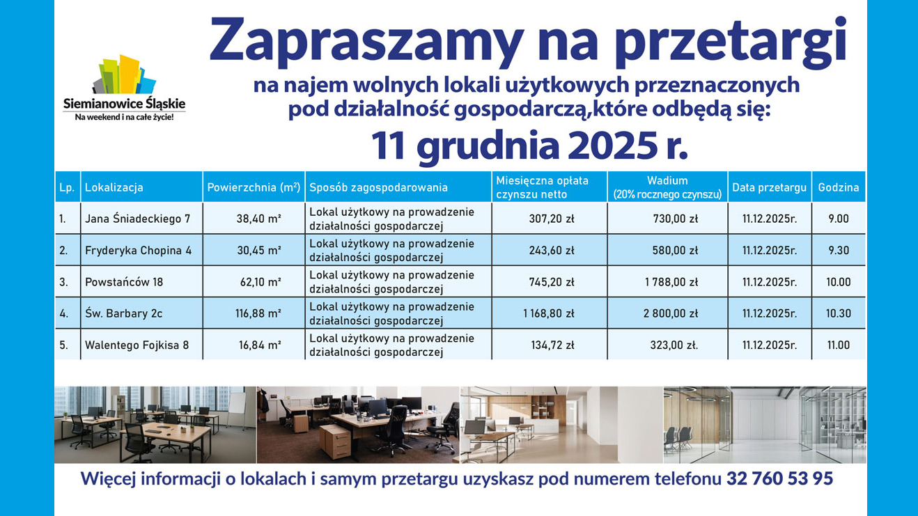 Urząd Miasta Siemianowice Śląskie zaprasza do udziału w przetargach ustnych nieograniczonych na wynajem lokali użytkowych, które odbędą się 11 grudnia 2025 r. w Sali Konferencyjnej w budynku Urzędu Miasta przy ul. Michałkowickiej 105.