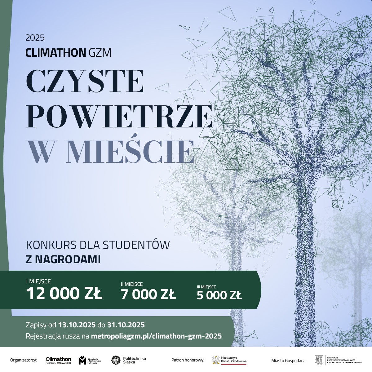 Rozpoczęła rejestracja do konkursu CLIMATHON GZM, który odbędzie się w dniach 5 – 6 listopada b.r. To 24-godzinny wyścig kreatywności odbywający się równolegle w ponad 100 miastach na świecie. Podczas metropolitalnego wydarzenia uczestnicy będą szukać rozwiązań w jaki sposób, w trosce o ochronę klimatu, możemy zadbać o czyste powietrze w mieście. Na autorów najlepszego pomysłu czeka nagroda główna w wysokości 12 000 zł. A przede wszystkim wspaniałe emocje i wielka satysfakcja. Konkurs skierowany jest do studentów wszystkich uczelni w całej Polsce. Wiedza specjalistyczna ani umiejętności programistyczne nie są potrzebne.
