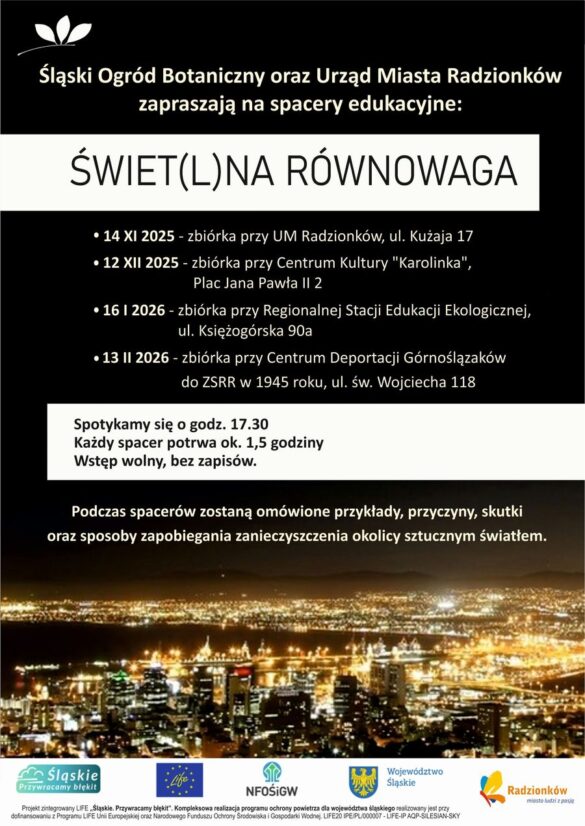 Śląski Ogród Botaniczny w Radzionkowie zaprasza w sezonie jesienno-zimowym do udziału w spacerach pn. „Świet(l)na równowaga”. Do wyboru, raz w miesiącu, są cztery różne spacery w czterech różnych lokalizacjach Radzionkowa. Można skorzystać z jednego spaceru lub ze wszystkich. Terminy: 14 XI 2025 – zbiórka przy…