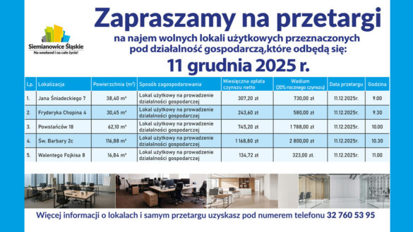Urząd Miasta Siemianowice Śląskie zaprasza do udziału w przetargach ustnych nieograniczonych na wynajem lokali użytkowych, które odbędą się 11 grudnia 2025 r. w Sali Konferencyjnej w budynku Urzędu Miasta przy ul. Michałkowickiej 105. Lokale użytkowe Jana Śniadeckiego 7 → Lokal użytkowy na prowadzenie działalności gospodarczej o…
