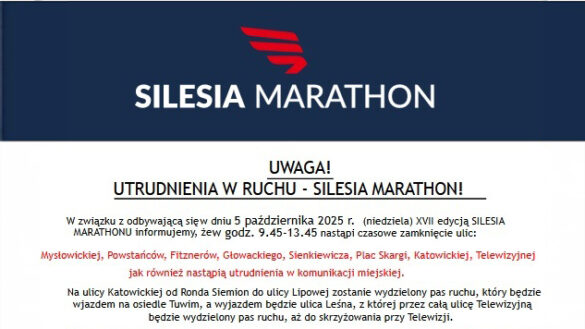 W związku z odbywającą się 5 października 2025 r. (niedzielę), XVII edycją SILESIA MARATHONU, informujemy, że w godz. 9.45 – 13.45 nastąpi czasowe zamknięcie ulic:  Mysłowickiej, Powstańców, Fitznerów, Głowackiego, Sienkiewicza, Plac Skargi, Katowickiej, Telewizyjnej, jak również nastąpią utrudnienia w komunikacji miejskiej. Na ulicy Katowickiej od Ronda Siemion do ulicy Lipowej zostanie wydzielony pas ruchu, który…