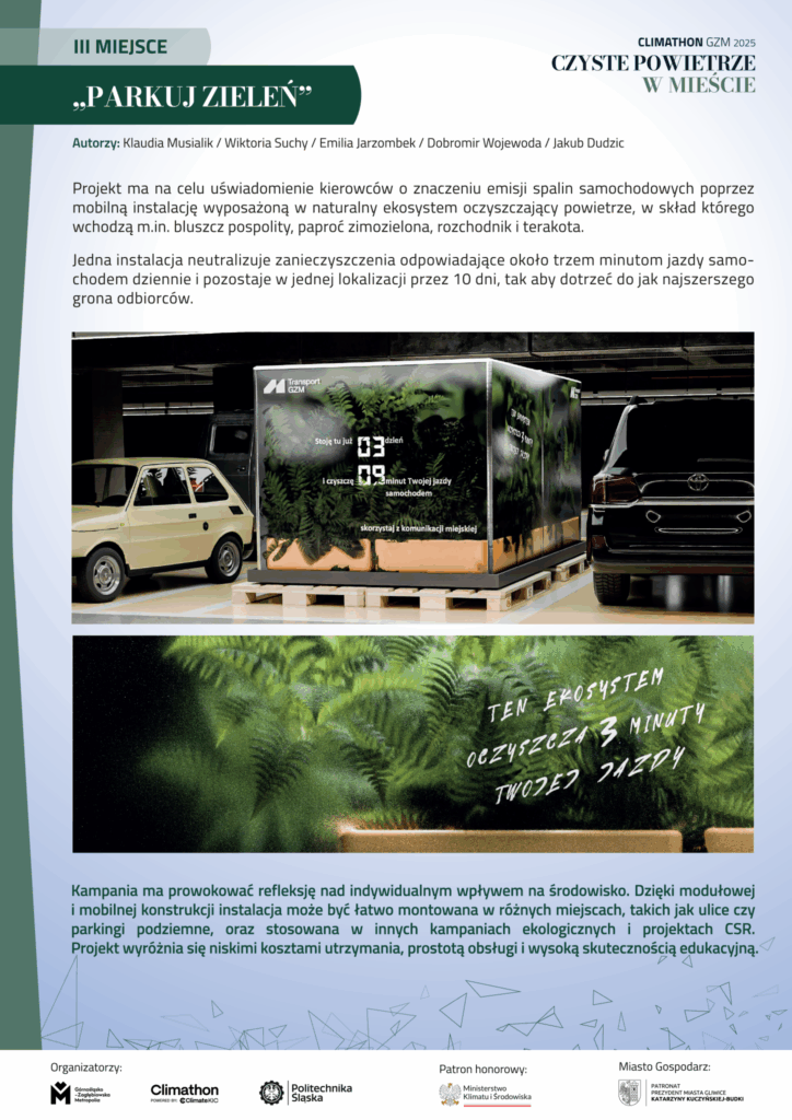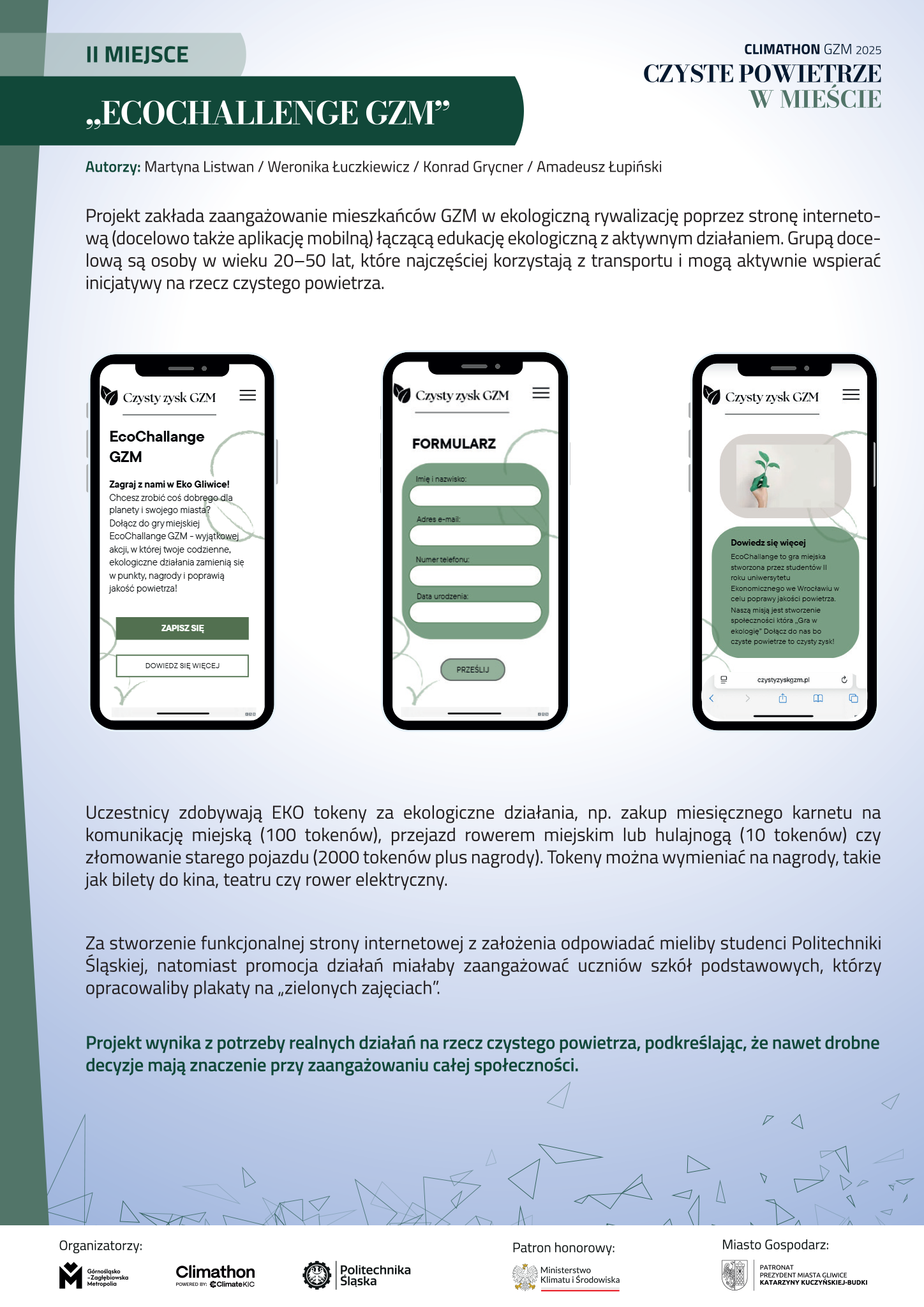 To wydarzenie, które ma charakter 24-godzinnej rywalizacji, w trakcie której uczestnicy we współpracy z zaproszonymi ekspertami i mentorami wypracowują propozycje rozwiązań, służących ochronie klimatu. Podczas Climathonu szansę na wygraną ma każdy kreatywny pomysł, który zaproponuje ciekawe i nowoczesne podejście do tematów związanych ze światowymi wyzwaniami klimatycznymi, w tym roku – z zielenią w mieście.